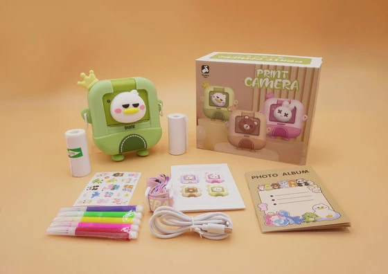 Zestaw aparat fotograficzny z funkcją natychmiastowego drukowania termicznego i akcesoriami dla dzieci od trzeciego roku życia. Aparat po zrobieniu zdjęcia natychmiast go drukuje w kolorze czarno białym. Do zestawu dołączono kolorowe pisaki, by twoja pociecha mogła pokolorować wydruk. Aparat posiada wejście na kartę TV, by Twoja pociecha mogła przechowywać wszystkie zdjęcia i filmy, gdyż model ten ma również funkcję nagrywania. Do zestawu, prócz wcześniej wymienionych pisaków dołączono również 2 rolki termiczne, kabel do ładowania, smycz, naklejki, albumik na zdjęcia. Aparat zasilany jest akumulatorem typu 3,7 V (w zestawie).