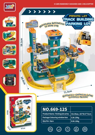 Znakomicie wykonany parking z efektem dźwięku i światła dla dzieci od trzeciego roku życia. Zestaw wykonany został z najlepszej jakości materiałów bezpiecznych dla dzieci w żywych kolorach. Parking posiada 2 poziomy, na których mieszczą się miejsca postojowe. Dostać do nich możemy się za pomocą elektrycznej windy zasilanej bateriami typu 3 x AA 1,5V (brak w zestawie). Na górze windy znajduje się panel odpowiedzialny za zjazd i wyjazd oraz efekty dźwiękowe w postaci wesołych melodii, odgłosów pojazdów, syreny i efekty świetne takie jak mrugające przyciski wjazdu i zjazdu. Autka zjeżdżać z góry mogą windą lub zjeżdżalniami. W zestawie znajdują się sześć autek i helikopter. Mamy też liczne latarnie, znaki drogowe i szlabany.