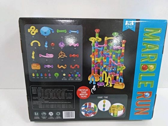 - elementy konstrukcyjne toru, - 15 kul szklanych, - 15 kul plastikowych, - 15 kul świecących w ciemności, - obrazkowa instrukcja. |