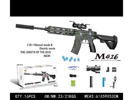 - karabin M416, - magazynek, - tłumik, - celownik, - USB kabel, - akumulator 7,4V - saszetka z kulkami do przygotowania, - pasek, - okulary ochronne, - instrukcja. |