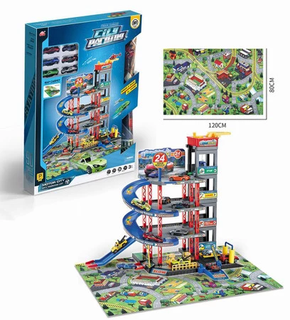 Duży interaktywny parking z windą, stacją, zjeżdżalniami dla autek i matą z drogami to propozycja dla dzieci od trzeciego roku życia. Parking posiada wiele poziomów, na które można dostać się za pomocą windy. Każdy z poziomów połączony jest z innym zjeżdżalnią dla resoraków. Wielopoziomowy parking posiada miejsca parkingowe, stację benzynową, podnośnik dla samochodów, myjnię oraz lądowisko dla helikopterów. Winda obsługiwana jest manualnie (korbka). W zestawie z parkingiem znajduje się też mata filcowa z ulicami i aż 6 pojazdów, typu resoraki.
