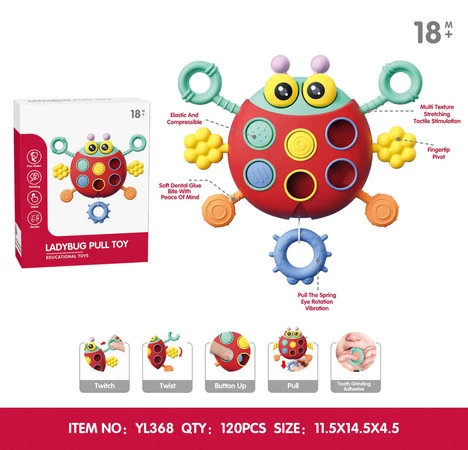 Wielofunkcyjna zabawka sensoryczna dla dzieci od osiemnastego miesiąca życia. Zabawka wykonana została z najlepszej jakości bezpiecznych materiałów w żywych kolorach przyciągających wzrok dziecka i zachęcających do zabawy. Zabawka w kształcie biedronki symuluje maluszka na wielu płaszczyznach. Wypustki o różnej teksturze idealnie nadają się do gryzienia, elementy do ciągnięcia, przesuwania, przekręcania ćwiczą rączki i rozwijają umiejętności poznawcze.